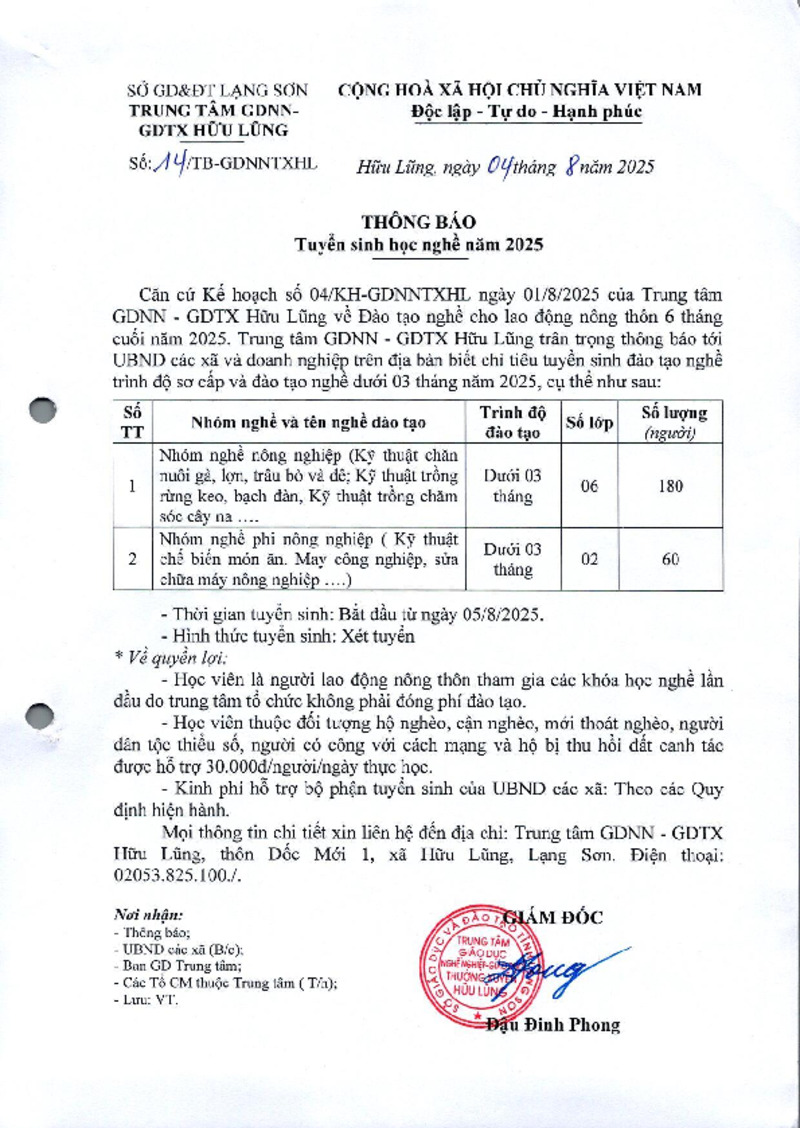 | Tiêu đề văn bản | Thông báo, Trung tâm GDNN - GDTX Hữu Lũng thông báo tuyển sinh học nghề 2025 | ||