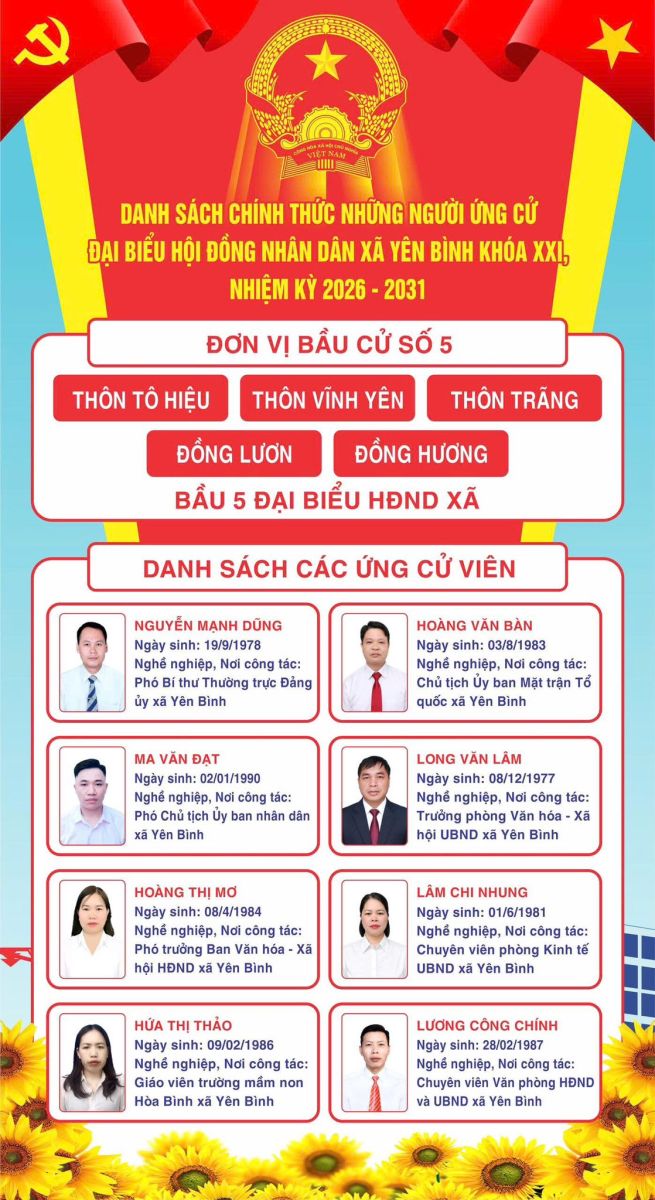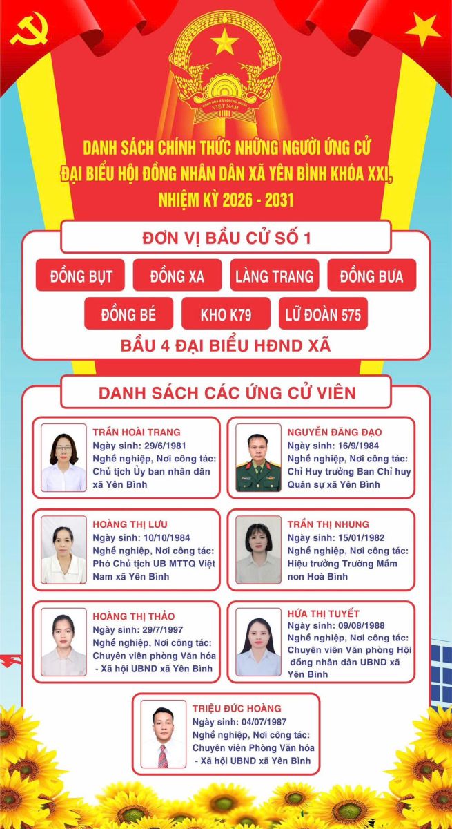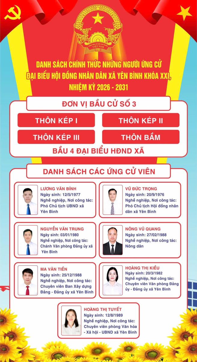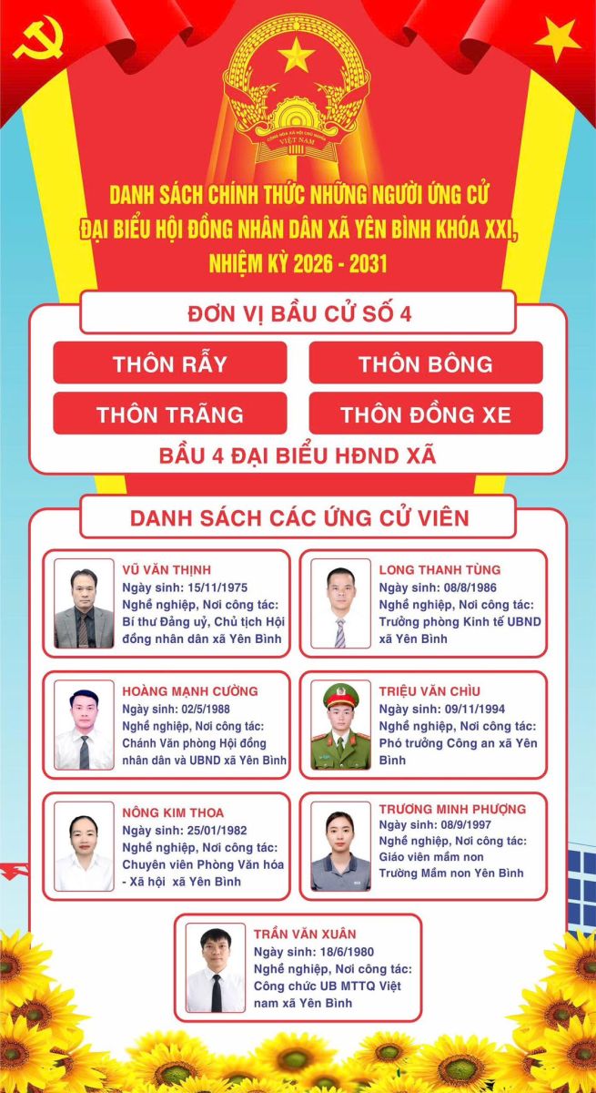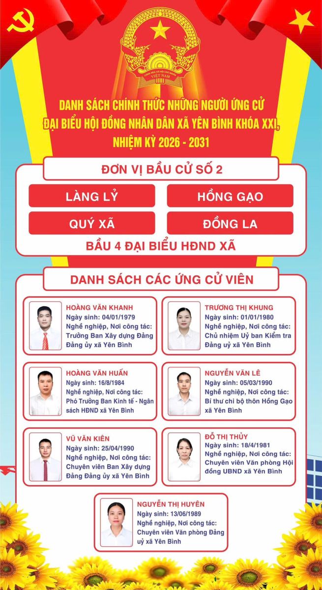 DANH SÁCH CHÍNH THỨC NHỮNG NGƯỜI ỨNG CỬ ĐẠI BIỂU HỘI ĐỒNG NHÂN DÂN XÃ YÊN BÌNH KHÓA XXI, NHIỆM KỲ 2026 – 2031 THEO TỪNG ĐƠN VỊ BẦU CỬ