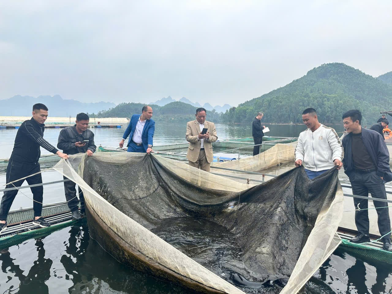 Tại đây đoàn Đoàn đã trực tiếp tham quan các lồng nuôi cá trên lòng đập Cấm Sơn.