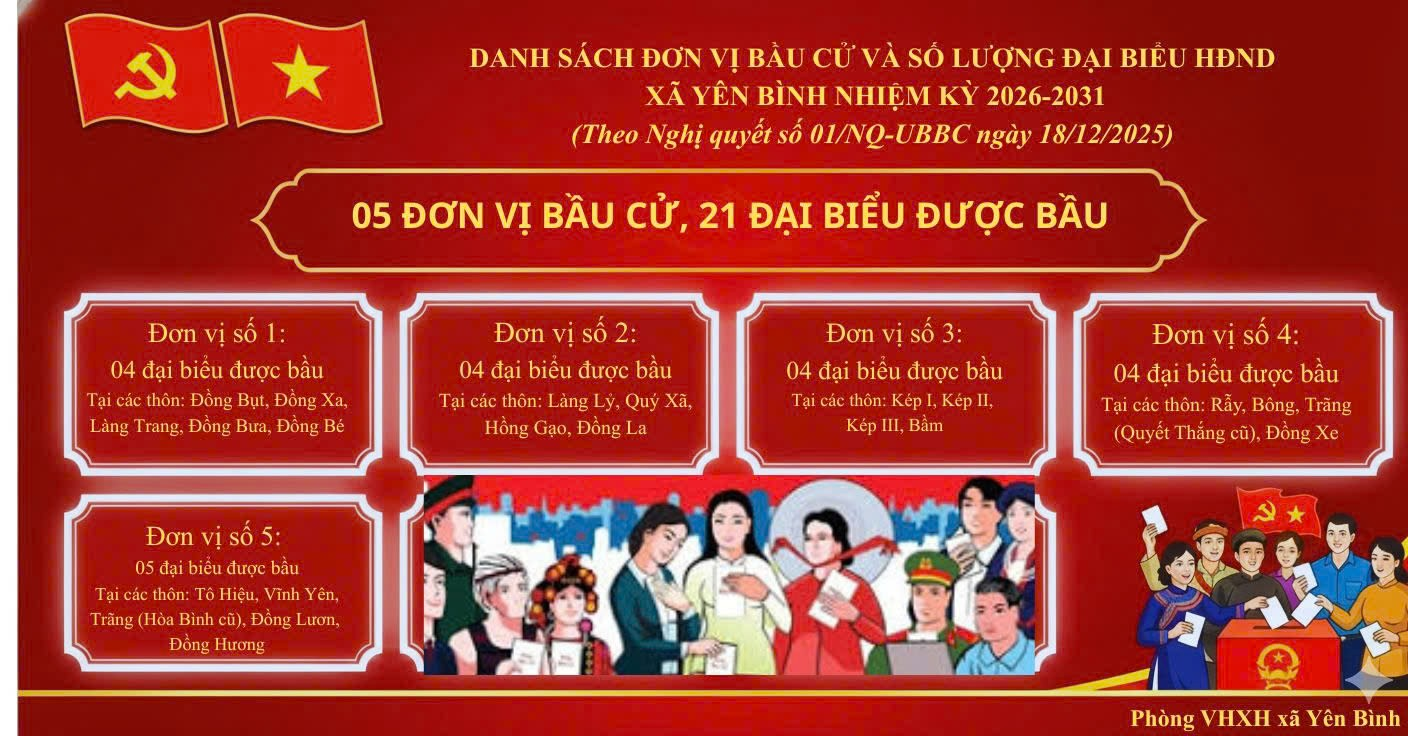 Ủy ban bầu cử xã Yên Bình công bố danh sách đơn vị bầu cử, và số lượng đại biểu HĐND xã Yên Bình nhiệm kỳ 2026 – 2030. Theo nghị quyết số 01 nghị quyết Ủy ban bầu cử ngày 18/12/2025. Gồm 5 đơn vị bầu cử và 21 đại biểu được bầu, cụ thể;