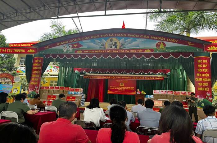 Ảnh: Lãnh đạo Công an tỉnh và các đơn vị hảo tâm tặng quà cho các trường