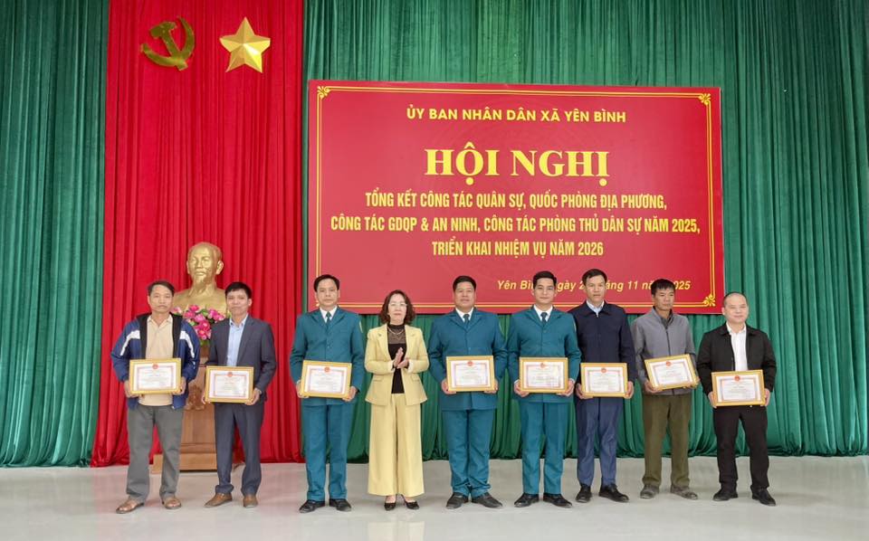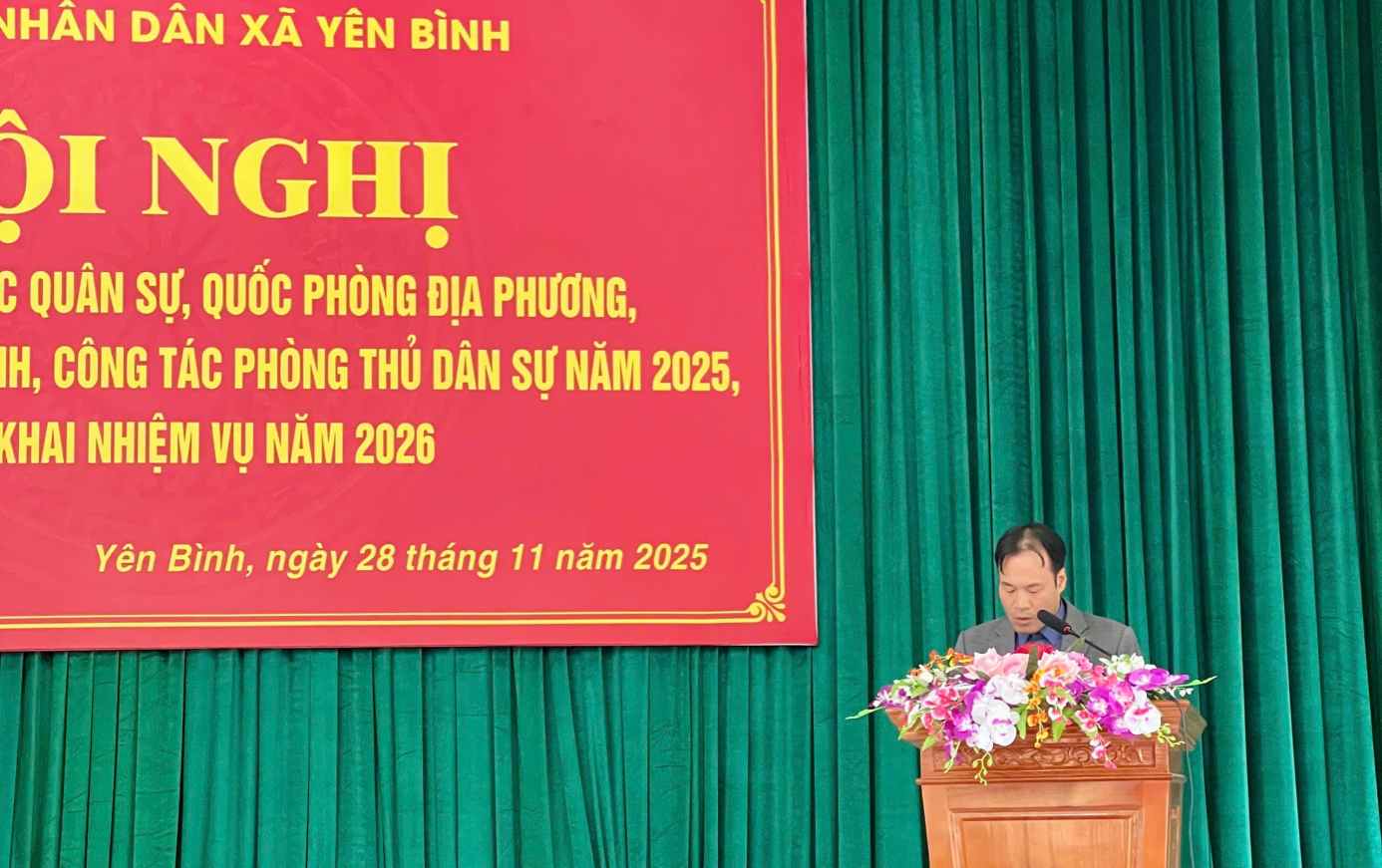 Chiều ngày 28/11/2025, UBND xã Yên Bình tổ chức Hội nghị tổng kết công tác quân sự, quốc phòng địa phương, công tác giáo dục quốc phòng - an ninh, công tác phòng thủ dân sự năm 2025, triển khai nhiệm vụ năm 2026. Dự hội nghị có đồng chi Vũ Văn Thịnh - Bí thư Đảng uỷ xã, đồng chí Trần Hoài Trang - Phó Bí thư Đảng uỷ, Chủ tịch UBND xã. Tham dự hội nghị còn có các đồng chí lãnh đạo ĐU, HĐND, UBND, UB MTTT, đại biểu của các đơn vị Ban Chỉ huy PTKV3 - Nhân Lý, Trung đoàn 12 - Sư đoàn 3, Phân kho 79 - Kho 671, Tiểu đoàn 4 - Lữ đoàn 575. Đại biểu Công an xã, các phòng, ban, ngành đoàn thể, Trưởng các thôn và các đồng chí Trung đội trưởng, tiểu đội trưởng và thôn đội trưởng trên địa bàn xã.