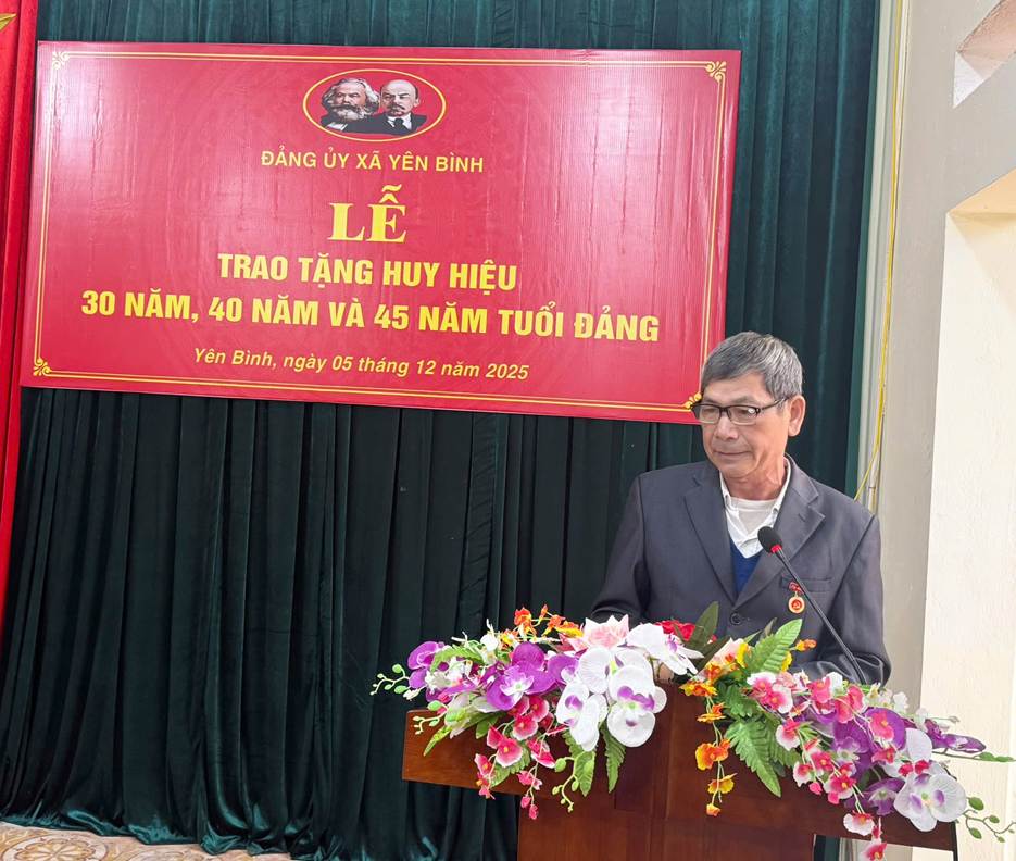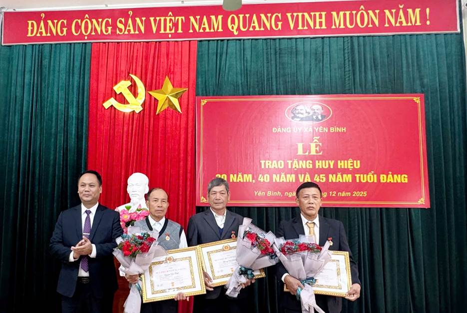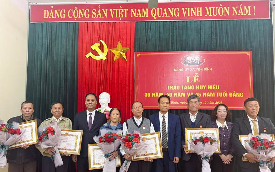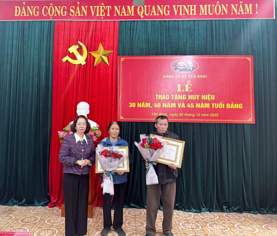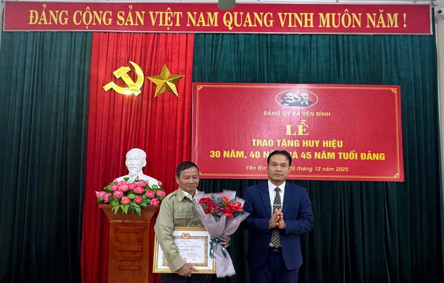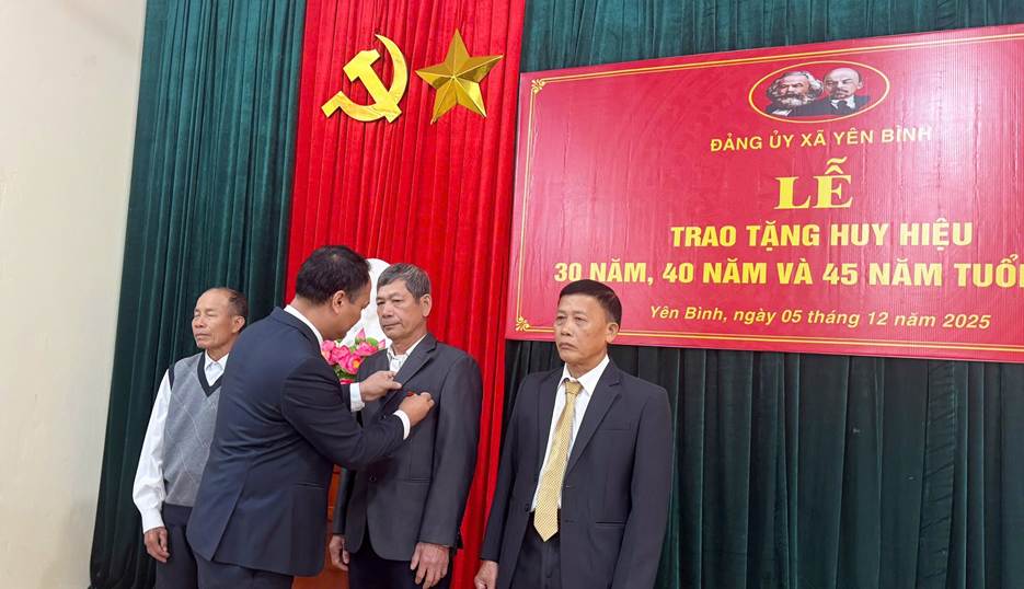 Ngày 05/12/2025, tại Hội trường tầng 1 trụ sở Đảng ủy xã Yên Bình, Ban Thường vụ Đảng ủy xã long trọng tổ chức Lễ trao tặng Huy hiệu 30 năm, 40 năm và 45 năm tuổi Đảng cho các đảng viên có nhiều năm cống hiến, gắn bó và trưởng thành trong sự nghiệp cách mạng của Đảng.
