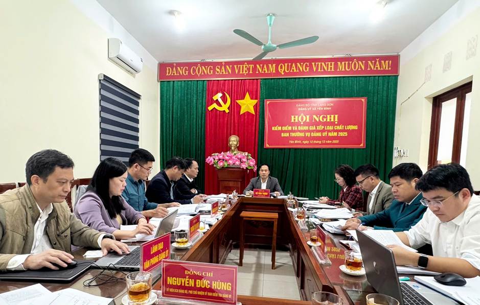 Ngày 12/12/2025, Ban Thường vụ Đảng ủy xã Yên Bình tổ chức Hội nghị kiểm điểm và đánh giá, xếp loại chất lượng tập thể Ban Thường vụ Đảng ủy năm 2025, bảo đảm nghiêm túc, đúng quy định của Bộ Chính trị và hướng dẫn của cấp trên. Tham dự Hội nghị có các đồng chí Ủy viên Ban Thường vụ Đảng ủy xã, Đại diện Ủy ban Kiểm tra Đảng ủy, Văn phòng Đảng ủy.