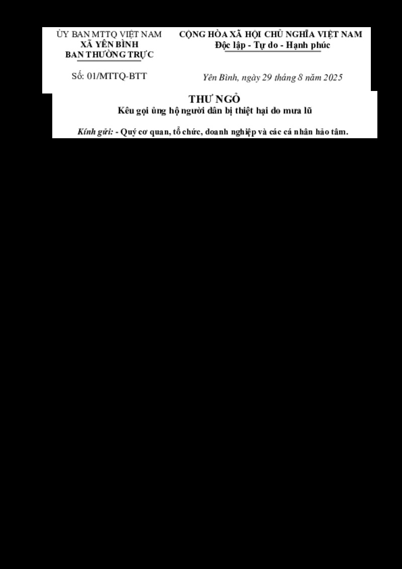 | Tiêu đề văn bản | Thư ngỏ kêu gọi ủng hộ người dân bị thiệt hại do mưa lũ | ||